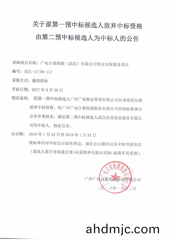 關(guan)于原第一預中標候選人(ren)放棄中標資格(ge)由(you)第二預中標候選人爲中標人的公告(gao)