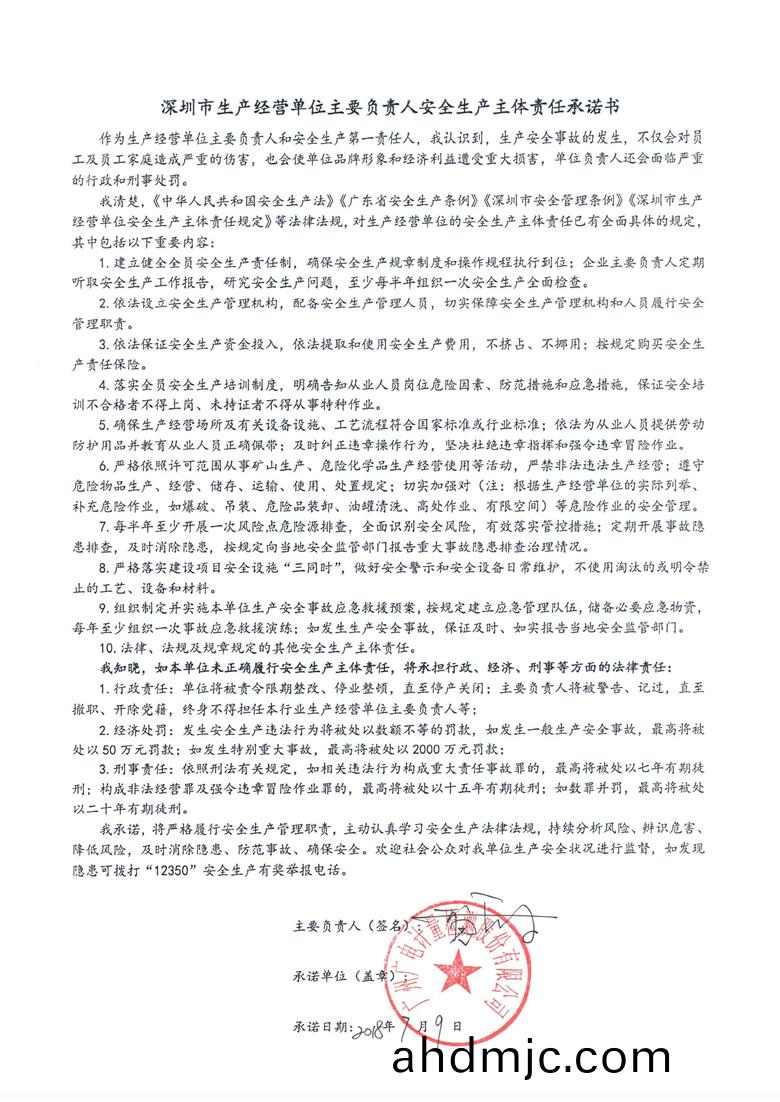 深圳市生産經(jing)營單位主(zhu)要負責人安全生産主體(ti)責任承諾(nuo)書