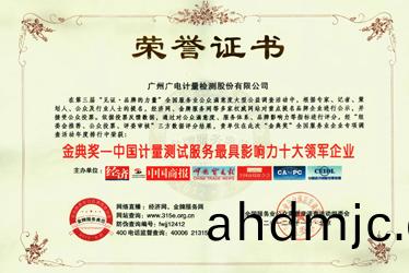 GRGT被評爲“中國計量(liang)測(ce)試服(fu)務最具影響力十大領軍企業”