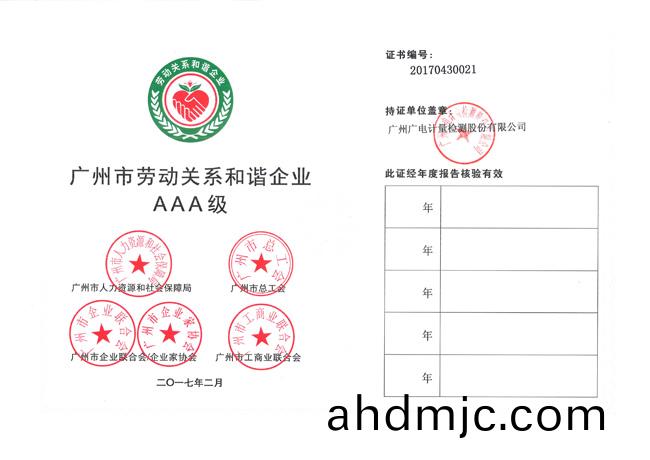 “廣州市勞動關係咊諧企業AAA級”榮譽證書