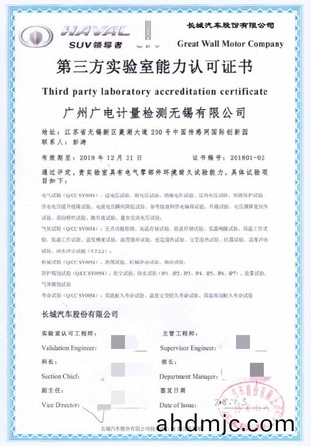 無錫子公司穫得長城汽車電(dian)氣(qi)零部件環境(jing)耐久試驗授權認可