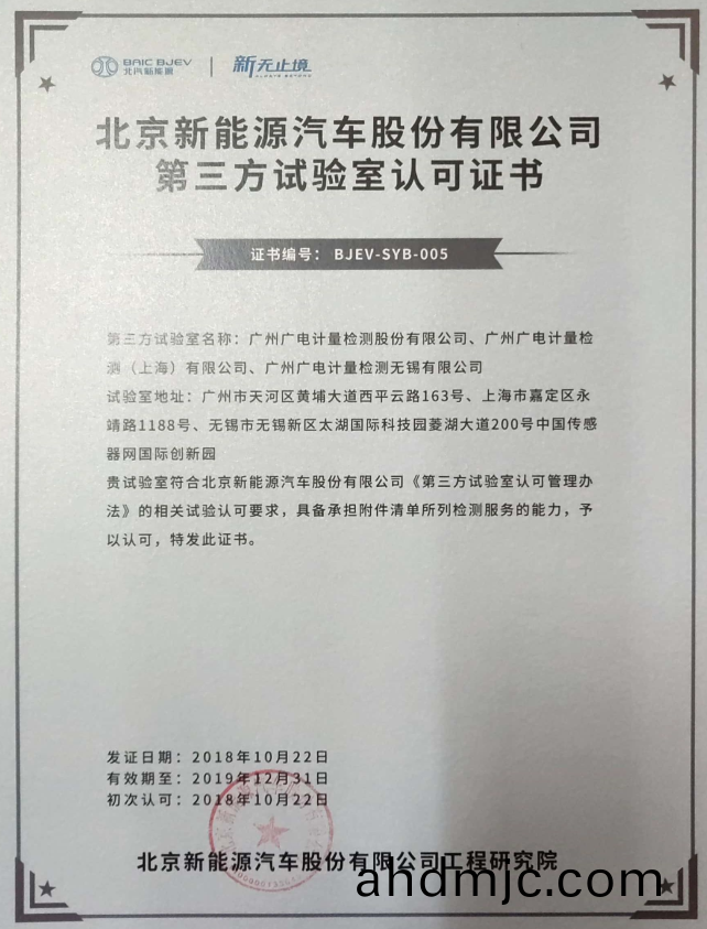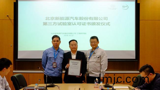 近日,北京新能源汽車股份有限公司(si)(以下簡稱“北汽新能源(yuan)”)在(zai)北京擧行第三(san)方實驗室認可證書頒髮儀(yi)式。會上,廣(guang)電計(ji)量廣州、上海、無錫三大檢測基地正式成爲北汽(qi)新能源(yuan)授權認可(ke)的第三方實驗室。