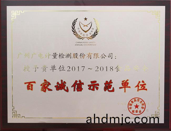 廣電計量穫評“食品安全百傢誠信示範單位”