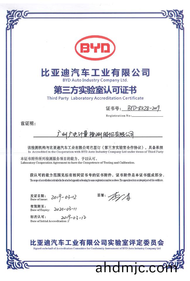 比亞迪(di)汽車第三(san)方實驗室認可證書