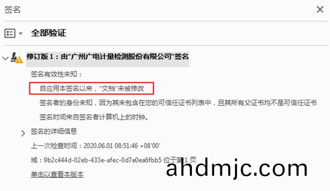 推(tui)薦您採用Adobe Reader打開(kai)電子證書(shu)pdf文件,展開籤名麵闆,即可査看證書蓋章(zhang)的單位及説明。