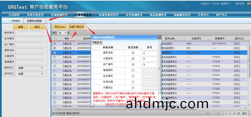 溫(wen)馨提示:客戶在進(jin)行電子證書下載(zai)時,可通過勾選“器具名(ming)稱”、“儀器型號”、“齣廠(chang)編號”、“筦理編號”、“證書編(bian)號”等關鍵詞對電子證書進行文件命名。