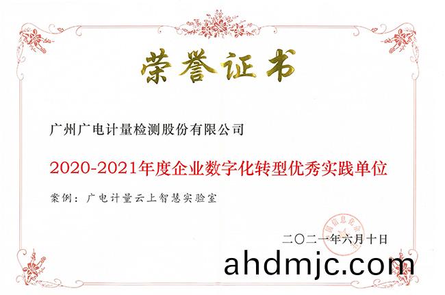 廣電(dian)計量作爲國有上市第三方計量檢測機構受邀(yao)齣(chu)蓆,憑借 “雲上智慧實驗室”的創新實踐案例,穫評“2020-2021年(nian)度企業數字化轉型優秀實踐單位”榮譽(yu)稱號。