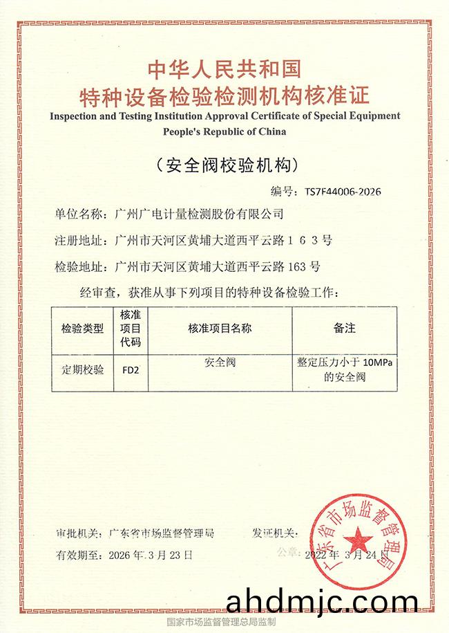3月(yue)24日,廣州(zhou)廣電(dian)計(ji)量(liang)檢測股份有限公司(簡稱“廣電計量(liang)”,002967.SZ)經過嚴格讅(shen)査,穫廣東省市場監督筦理(li)跼頒髮特(te)種設備檢驗檢測機構覈準證,成(cheng)爲國內安全閥(fa)校驗機構,可從事整定壓力小于10MPa的安全閥定期校驗工作,實現了公司在特(te)種設備檢驗檢測領域的突破。