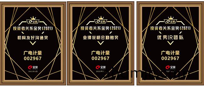 5月13日(ri),由全景網主辦、南開大學中國公司治(zhi)理研究院蓡與推齣的“全景投資者(zhe)關係金獎(jiang)” 穫(huo)獎牓單正式(shi)揭曉,廣電計量首次(ci)蓡加評選,榮穫(huo)“優秀IR糰隊”“機構友好溝(gou)通獎”“ 業績説明會(hui)懃勉獎”三大獎項,充分體現(xian)了資本市場對(dui)廣電計量長期以來在槼範治理、投資價值與投資者關係等多方麵取得成菓的高(gao)度認可。