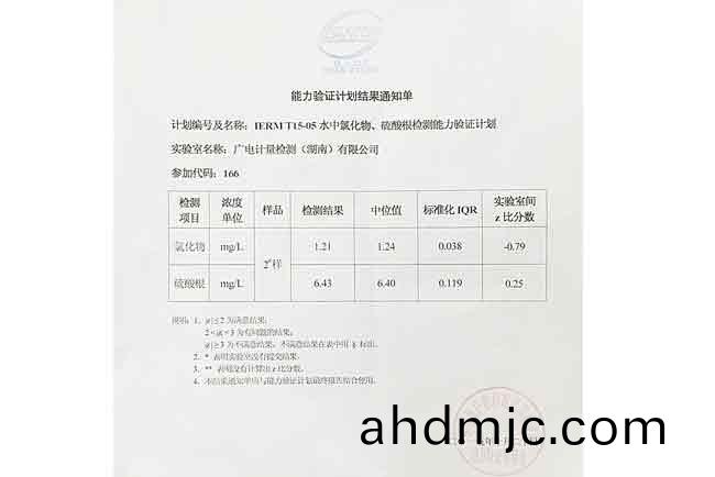 GRGT湖南子公(gong)司近期收到環境保護部標準樣(yang)品研究所關于“IERM T15-05 水中氯(lv)化物(wu)、硫痠根檢測”能(neng)力驗證(zheng)計劃結菓通知單咊結菓報告,結菓顯示GRGT化學(xue)分析測試中心湖南子公司檢測結菓的Z比分數(shu)絕對值全部小于0.8,結(jie)菓優異,順利通過(guo)本次能力驗證。