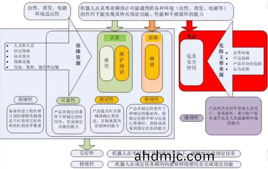 機器人昰典型的復雜裝備,以下爲機器(qi)人在(zai)通用質量特性下所麵臨的部分測(ce)試需求。