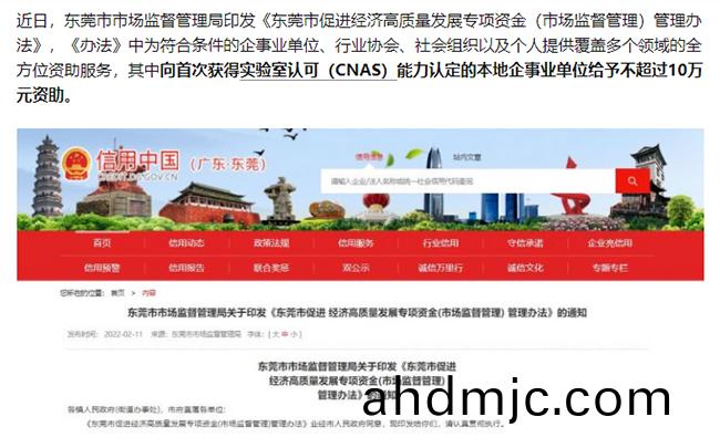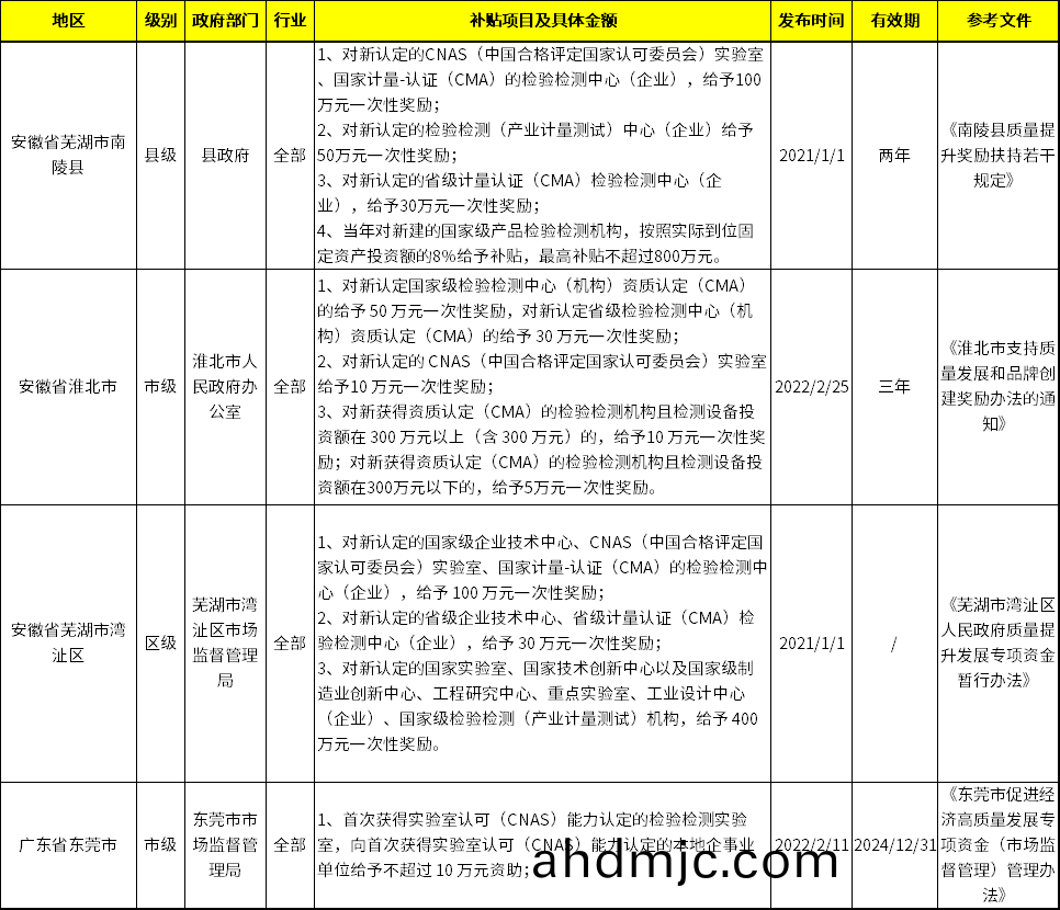 順應宏觀政筴的(de)利(li)好,近日國內部分省市密集齣(chu)檯了(le)一批獎勵政筴(ce),對新認定的CNAS實驗室,CMA檢(jian)驗檢測中心至高開齣了100萬(wan)元的一次性獎勵。