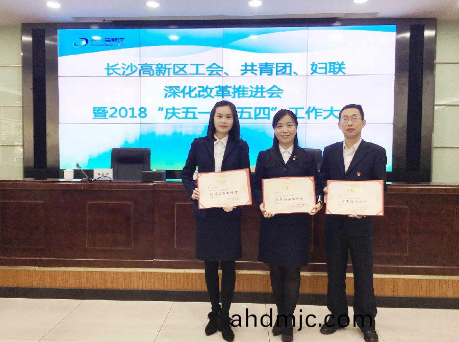 湖南(nan)子公司(si)曏勇(右)、劉(liu)麗娜(中)、張琹(左)分彆穫長沙高新區工會“青年崗位(wei)能手(shou)”、“優秀工會工作者”、“優(you)秀婦(fu)女工作者”稱號