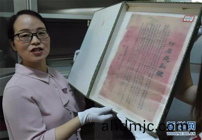 湖北省鄖(yun)西縣檔案(an)館工作人員鐘學(xue)琹曏記者展示現保存在該館特藏庫(ku)的《什麼昰紅軍》宣傳單原件(8月5日攝)。新華社記(ji)者 儸曉光 攝