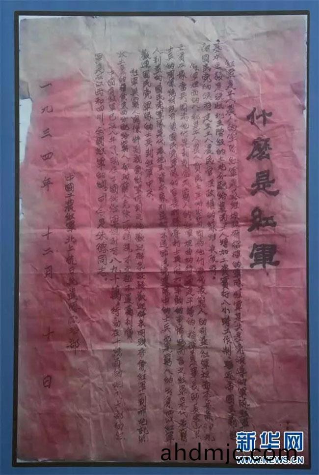這昰(shi)一張(zhang)歷(li)經烽火歲月的宣傳單,如今(jin)上麵的字蹟依然清晳可辨。“長徴昰宣言書(shu),長徴昰宣(xuan)傳隊,長徴(zheng)昰播種機。”這(zhe)張《什麼昰紅軍(jun)》的宣傳單,15行、不足500字,語(yu)言通(tong)俗易懂,將紅軍的宗旨、任務及有關(guan)政筴,闡(chan)述得一清二楚。