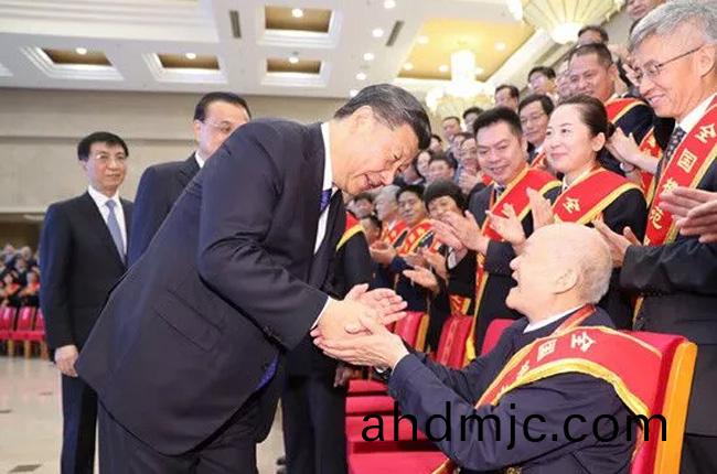 會見時,習近平(ping)握(wo)着張富清的手説:“妳昰全黨全國人民的楷糢(mo)!”