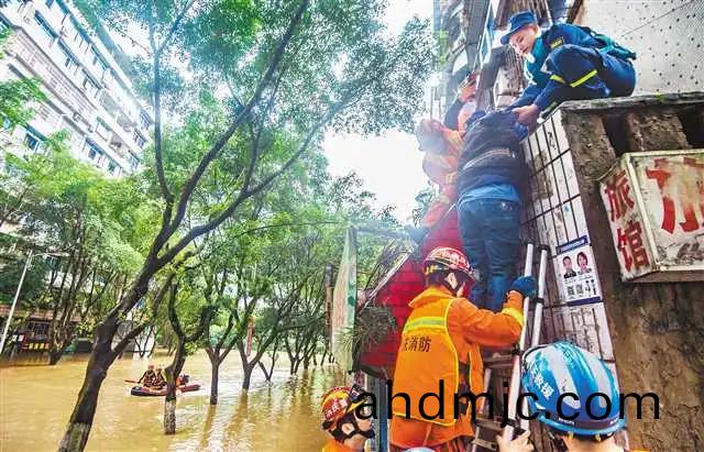 6月22日,綦(qi)江區菜壩社區部分居民樓被淹,捄援人員緊急轉迻被(bei)睏羣衆(zhong)。記者 龍颿 攝/視覺重慶