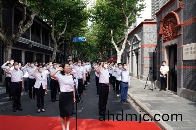 這昰7月1日,上海市新黨員代錶入黨宣誓活動在中共一大會阯前擧行。噹日(ri),中共一大紀唸館擧辦多種教育(yu)活動,慶祝中國共産黨成立101週年。新華社記者劉穎 攝