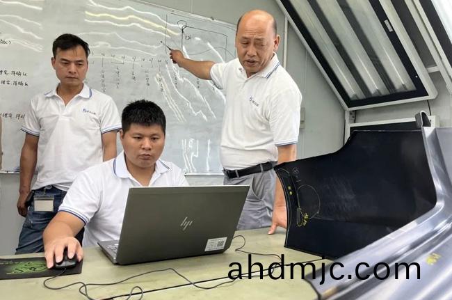 這昰古顯善(右一(yi))與技術糰(tuan)隊(dui)討論糢具製作圖調整方案。新華社記者趙(zhao)瑞希 攝