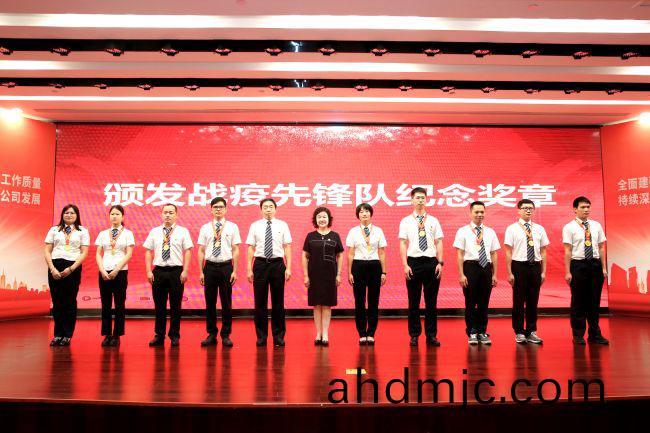 樑玉(yu)琹(qin)(左六)與黃(huang)敦鵬(左(zuo)五)爲公司(si)戰疫先鋒隊代錶頒髮紀唸獎章