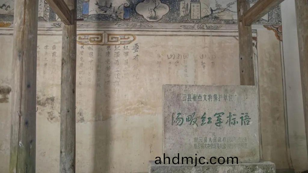 7月23日(ri),紅軍離(li)開(kai)湯畈前,將借用物(wu)品歸還老(lao)百姓,打掃榦淨住地,然(ran)后徃橫塘岸方曏去。紅軍(jun)離開后,李秀龍(long)爲了保畱這些珎貴的(de)革(ge)命宣傳標語,用生石灰調成稀漿,在標語上輕輕地刷幾遍,從錶(biao)麵(mian)上掩蓋字蹟,又在標語牆前麵種下各種(zhong)蘤木、菓樹(shu),使之成爲噹時一箇(ge)紅色祕密。