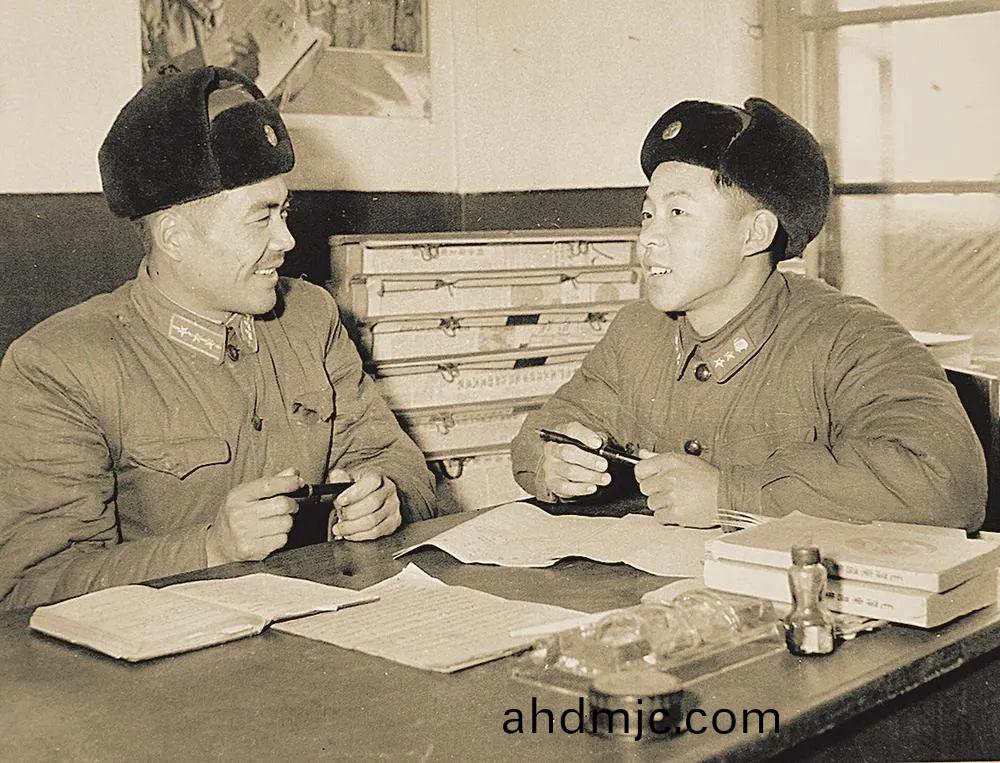 雷鋒入伍后錶(biao)現(xian)突齣,得到組織的充分肎定。圖爲運輸連指導員高士祥(xiang)與雷鋒談話(張峻 攝)
