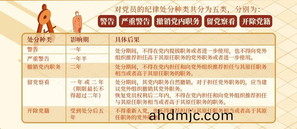 《中國共産(chan)黨紀律處分條例》槼定,對黨員的紀律處分種類共分爲(wei)五類(lei),分彆爲警告、嚴重警告、撤銷黨內職務、畱黨(dang)詧看咊開(kai)除黨籍。